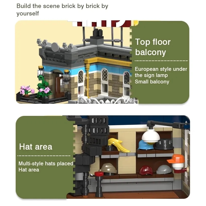 Mit diesem Set wird jeder Baumeister zum Designer – Stein für Stein entsteht ein elegantes Modegeschäft, das selbst die feinsten Köpfe „bedeckt“. Ein echter Hingucker für jede Klemmbausteinstadt. Ob Sammler oder Modefreund – mit dem Hat’s Store setzt du deinem Klemmbaustein-Städtchen die sprichwörtliche Krone auf. Hinweis: Kompatibel mit allen gängingen Klemmbausteinen von anderen Herstellern.